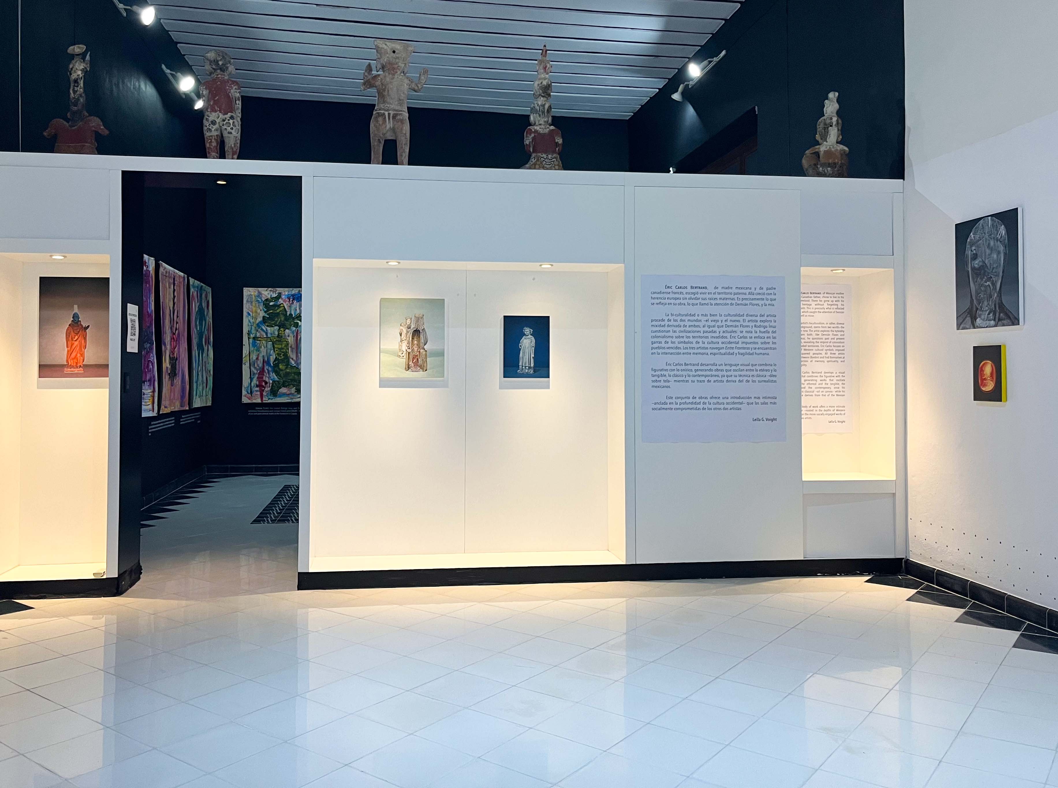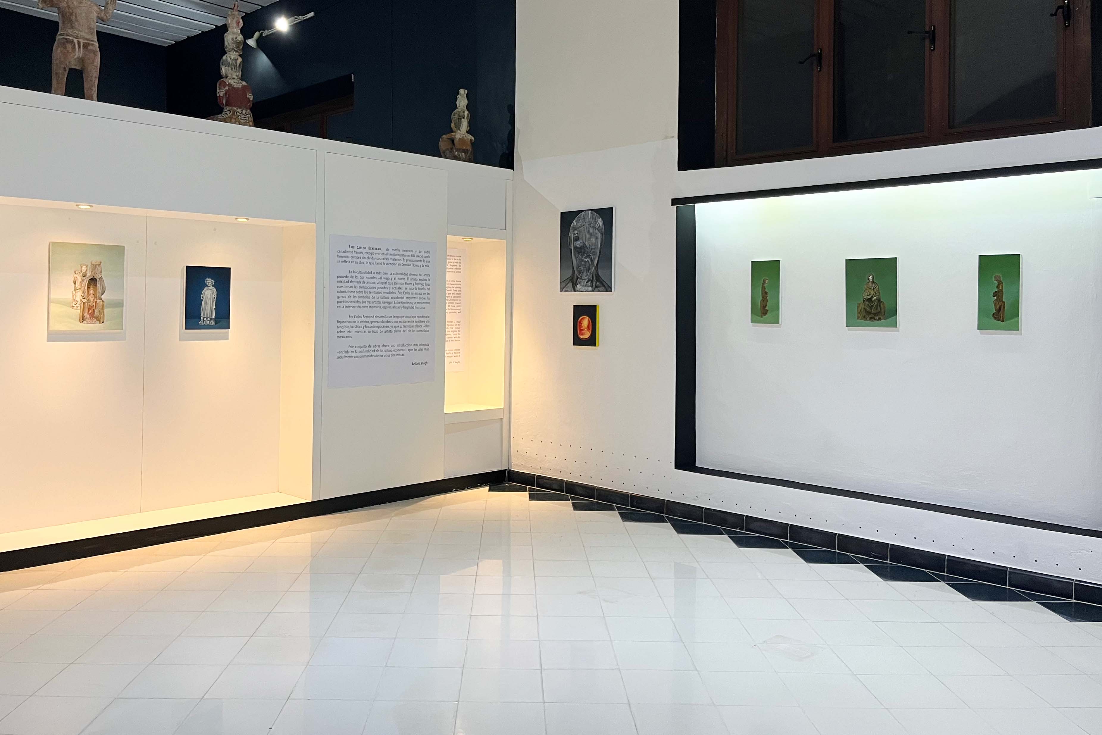 La bi-culturalidad o más bien la culturalidad diversa del artista procede de los dos mundos —el viejo y el nuevo. El artista explora la mixidad derivada de ambos; al igual que Demián Flores y Rodrigo Ímaz cuestionan las civilizaciones pasadas y actuales: se nota la huella del colonialismo sobre los territorios invadidos. Éric Carlos se enfoca en las garras de los símbolos de la cultura occidental impuestos sobre los pueblos vencidos. Los tres artistas navegan Entre Fronteras y se encuentran en la intersección entre memoria, espiritualidad y fragilidad humana.